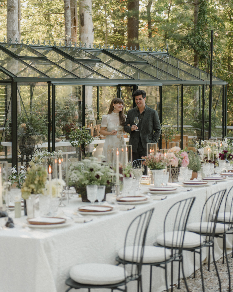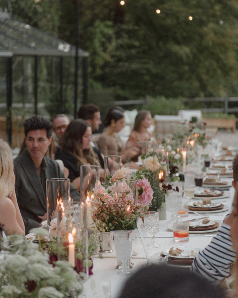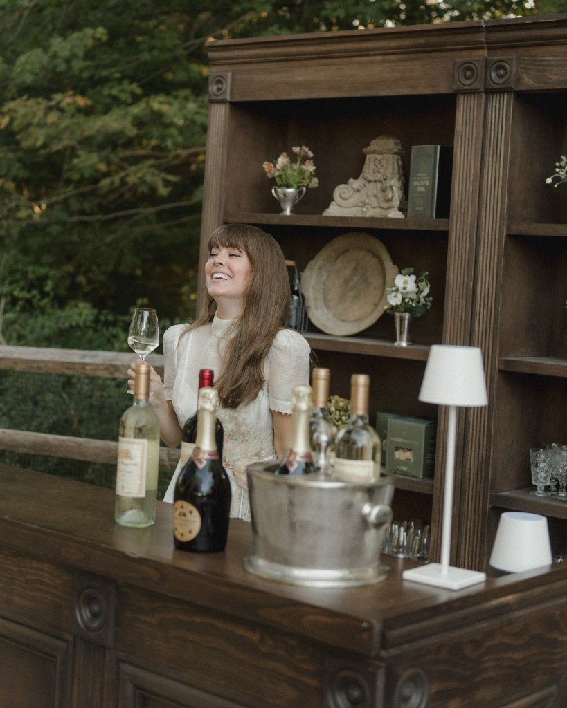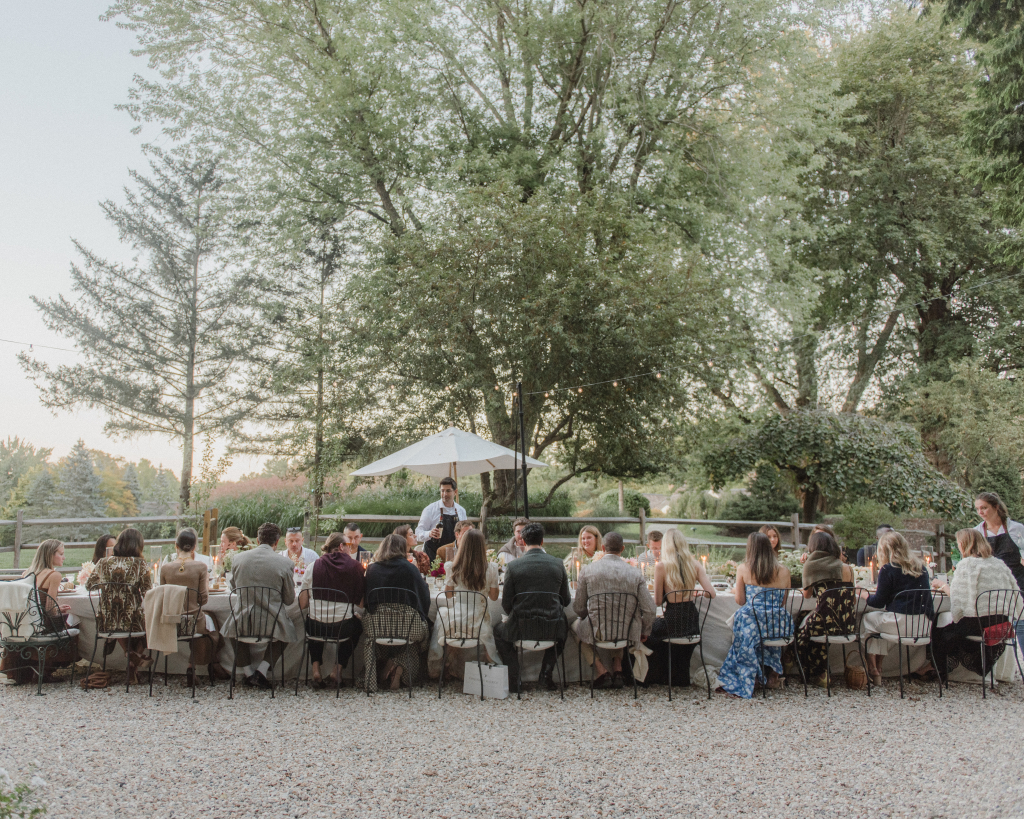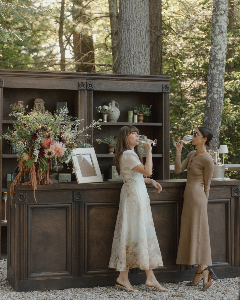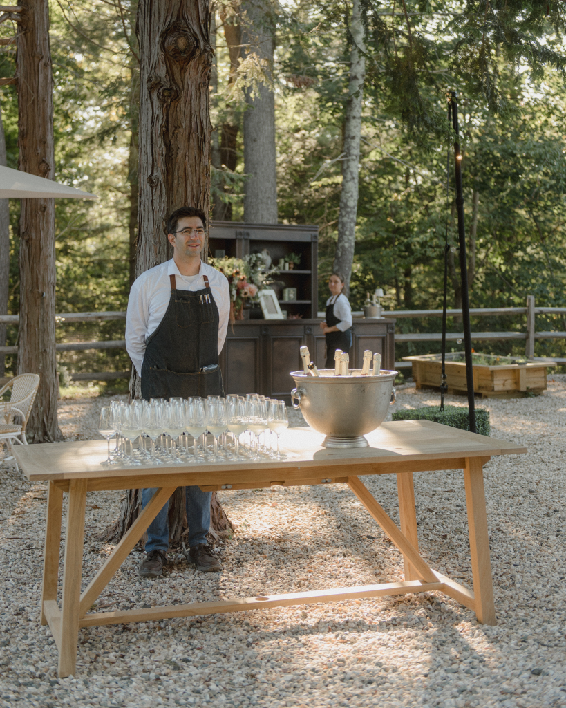 For this intimate garden dinner at Mayflower Inn & Spa, Kadeema provided the bar and seating elements that helped ground the outdoor environment with warmth and intention. A walnut bar, coordinating shelving, and clean-lined dining chairs added structure and function while complementing the natural, understated aesthetic of the event.